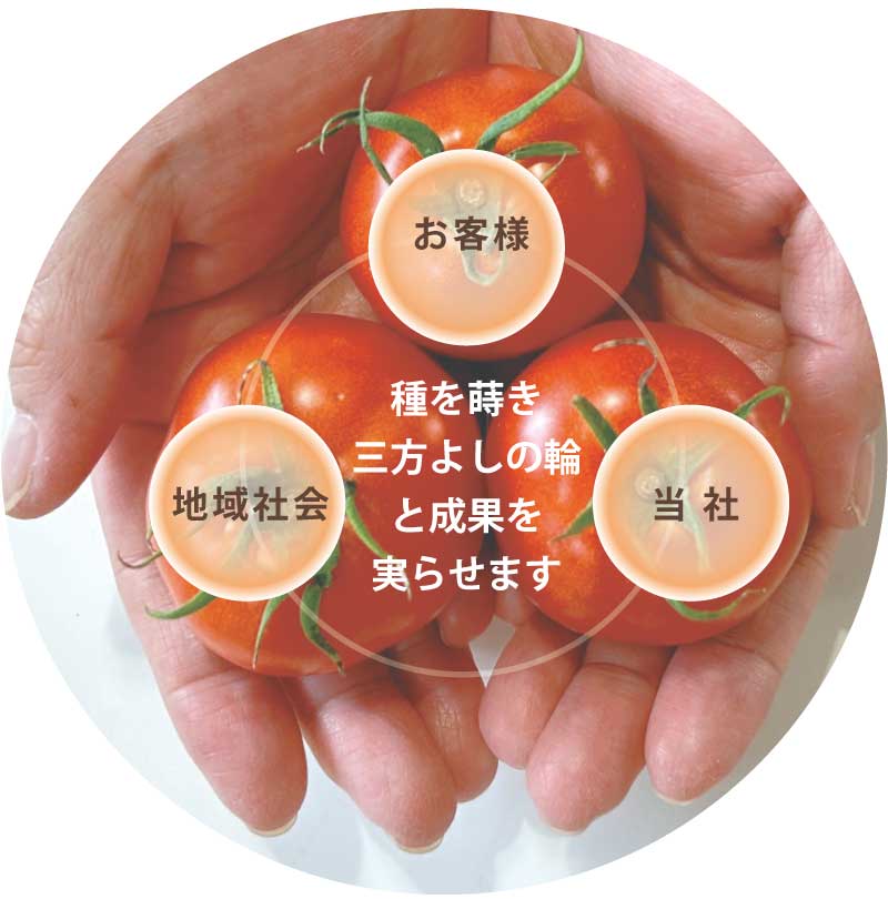 今から約550年前に、地元あわら市の吉崎で蓮如上人が「自利利他」の心による商いを説いた。「売り手」「買い手」「世間(社会)」のすべてが満足できるように、事業活動をおこなう精神です。弊社もこの精神を信条に、お客様、地域社会、当社と関連がある方々が幸せになるよう、「三方よしの精神」で継続、発展してまいります。